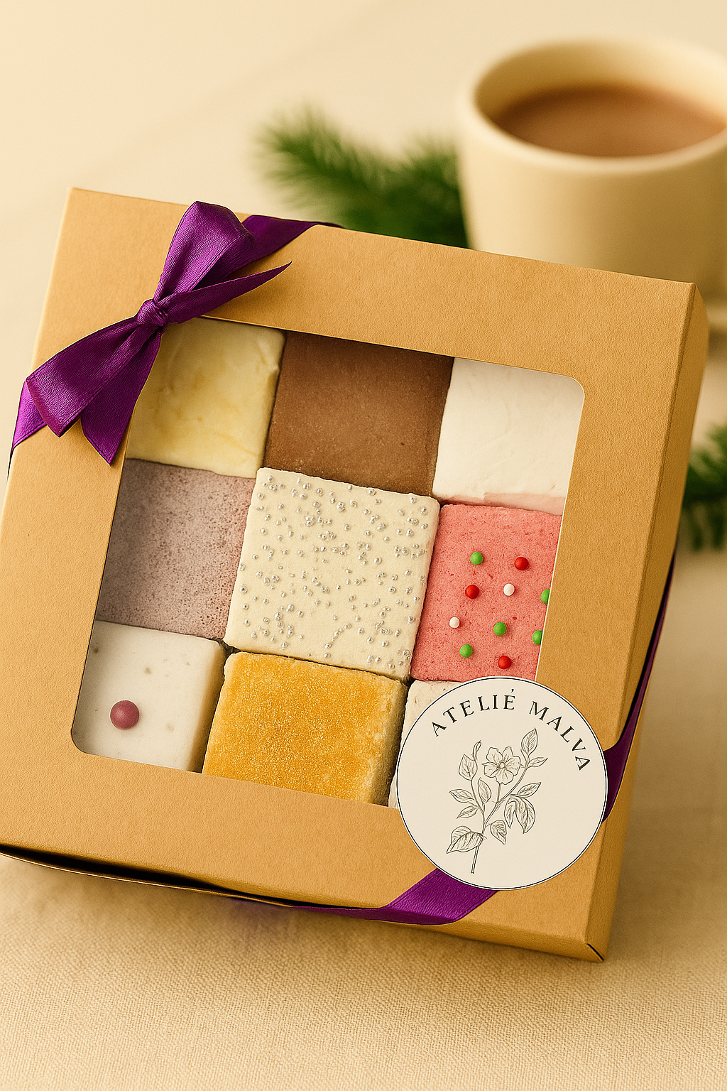 Socker, glukos, nötgelatin, läkemalva, salt, vaniljpulver, tapioka